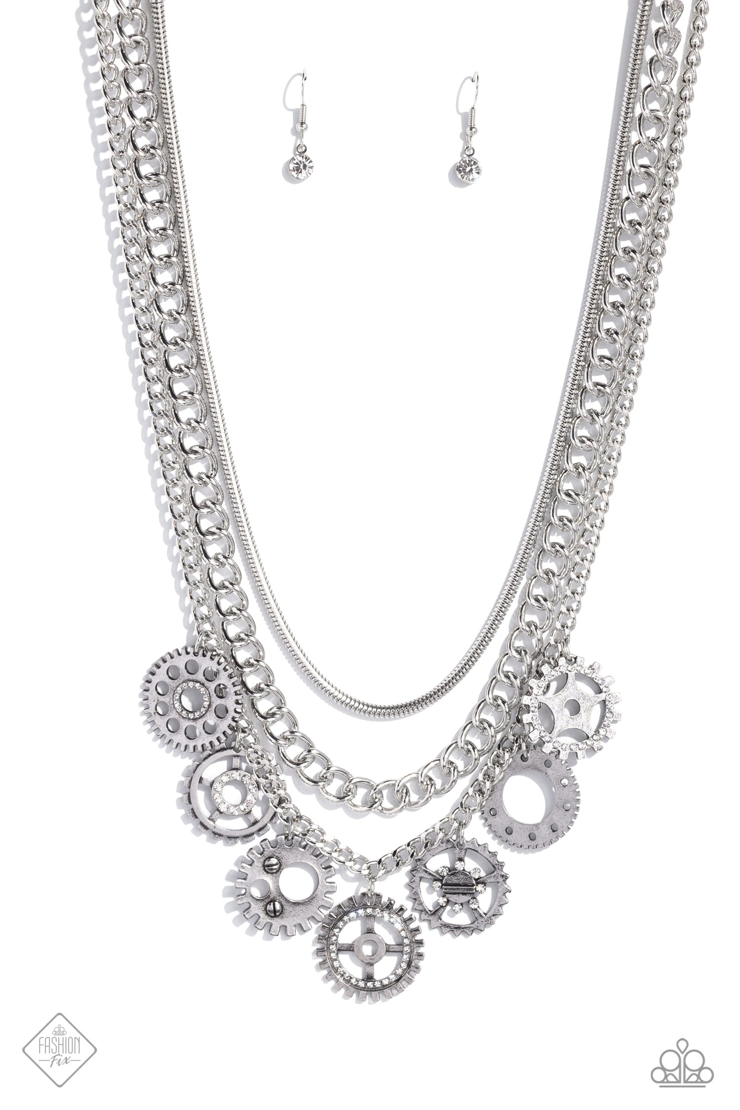Gear pendants with varying textures, details, sizes, and a dusting of white rhinestones, swing from a thick silver curb chain, creating a steampunk-like fringe. A silver snake chain and an additional silver curb chain combine with the grungy, industrial display for additional sheen and attitude. Features an adjustable clasp closure.